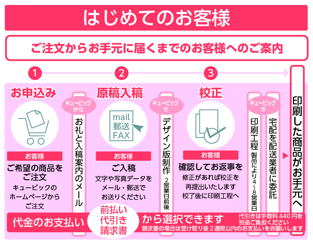 当ショップでお申込みを確認後、お礼と内容ご確認のメールを差し上げます。メールには「お届け先を記載ください」「代金額とお支払方法のご指定」「原稿を記載ください(原稿入稿)」が記載されております。