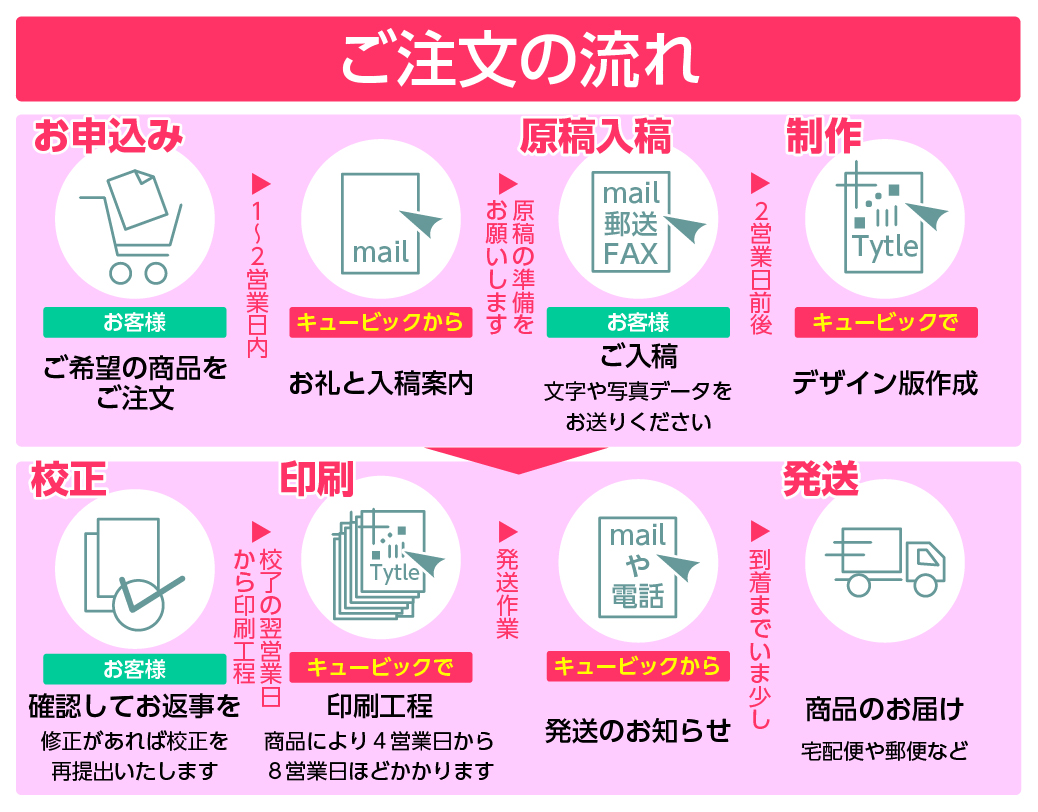ご注文のあと:お礼のメールに、代金(商品代金に納品送料を加えた価格)のお知らせと、お支払方法のご案内、ご入稿のご案内を差し上げます。メールは営業時間内にお送りいたしますので、ご注文の翌営業日となることがございます。