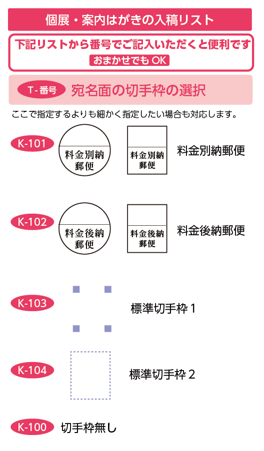 切手枠は選択の他にも自由に作成することができます。クラブや教室のロゴをあしらった切手枠も人気です。多枚数の発送時において、料金別納スタンプなども実労力を削減できますのでご一考ください。
