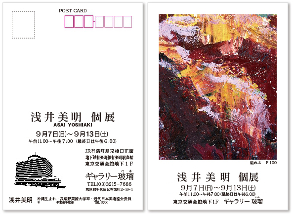 個展の告知に最適な案内はがき印刷。作品写真を使って作る、あなたの展覧会に招待するはがきを作成。当店デザイナーがあなたの希望に沿ってデザイン案を作成。印刷前に確認できるから安心です。はがきのサイズは短辺が5mm大きい105mm×148mm。写真面(カラー面)は艶のある鏡面仕上げ用紙・宛名面は上質仕上げだから宛名も書きやすくなっています。ワイドサイズのはがきは郵便料金は85円で送れます。