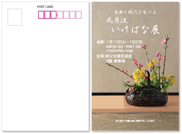 個展の告知に最適な案内はがき印刷。作品写真を使って作る、あなたの展覧会に招待するはがきを作成。当店デザイナーがあなたの希望に沿ってデザイン案を作成。印刷前に確認できるから安心です。はがきのサイズは短辺が5mm大きい105mm×148mm。つや消しのマット用紙に印刷しますのでしっとりとした落ち着きがあります。厚みと硬さがある用紙です。ワイドサイズのはがきは郵便料金は85円で送れます。