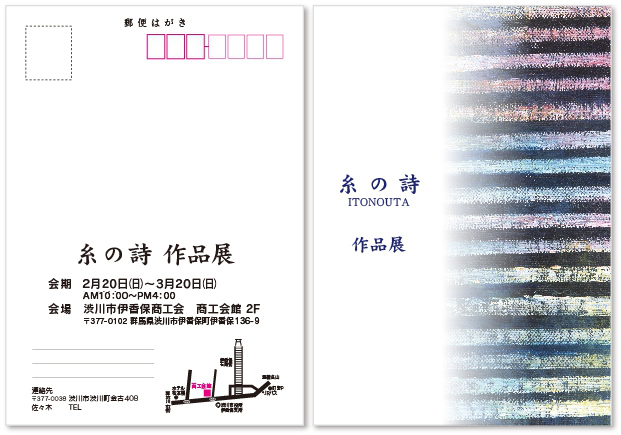 個展の告知に最適な案内はがき印刷。作品写真を使って作る、あなたの展覧会に招待するはがきを作成。当店デザイナーがあなたの希望に沿ってデザイン案を作成。印刷前に確認できるから安心です。つや消しのマット用紙に印刷しますのでしっとりとした落ち着きがあります。厚みと硬さがある用紙です。はがきのサイズは官製はがきと同サイズの100mm×148mm。すぐ下の「選択」の下をクリック(タップ)して枚数を選ぶと枚数ごとの価格が表示されます。