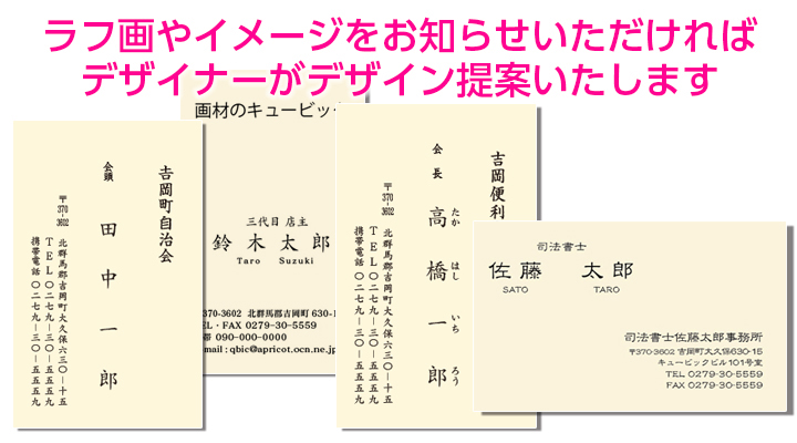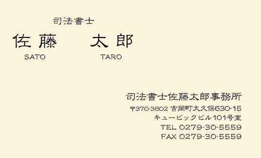 やさしい感じを受ける生成り(きなり)用紙を使用した名刺です。文字だけの名刺におすすめ。縦に使うと士業の方にも最適です。名刺の中で当ショップ一番人気です。100枚単位のご注文をお受けしています。